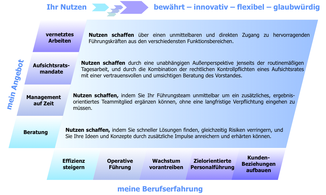 Die Nutzung meiner Erfahrung kann ganz unterschiedliche Formen annehmen: eine umfassende Beratung,oder ein Mandat für ein Management auf Zeit / Interim Management mit Verantwortung für die Umsetzung, als Mitglied in einemAufsichtsrat / Beirat, um eine konstruktiv kritische und unabhängige Außenperspektive einzubringen, oder ein internationalvernetzes Arbeiten mit Führungskräften aus den verschiedensten Funktionsbereichen.